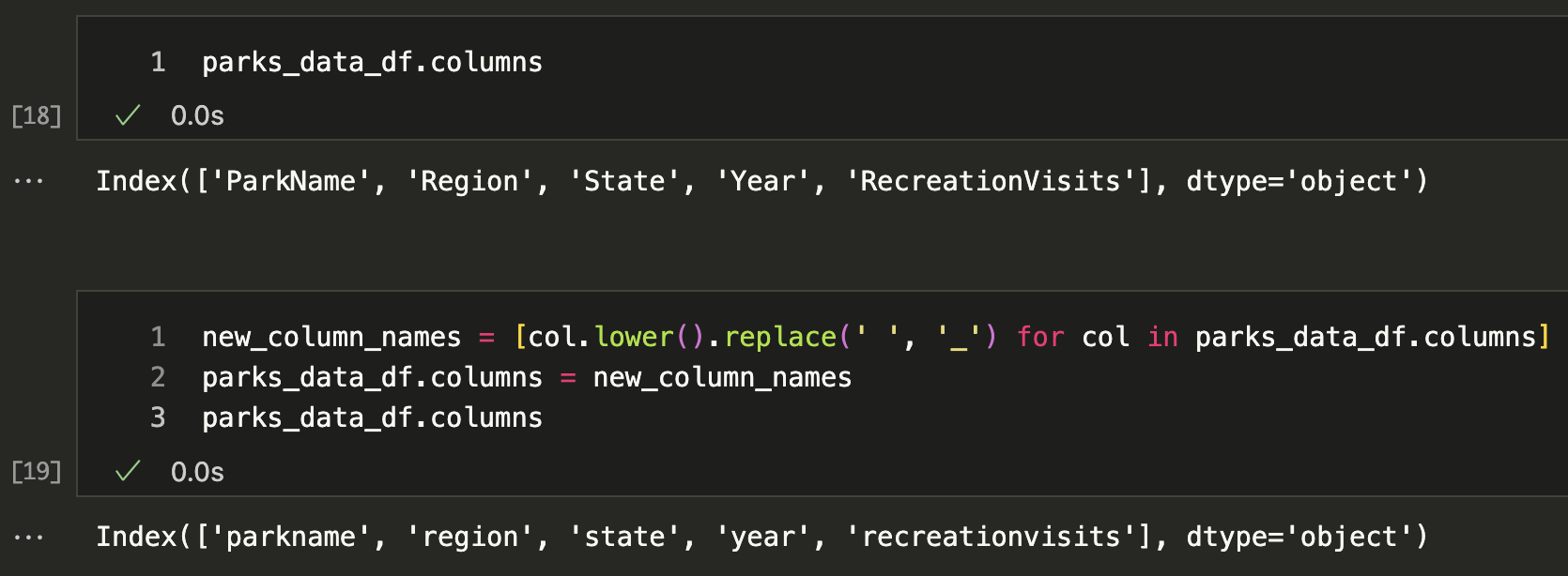 new_column_names = [col.lower().replace(' ', '_') for col in parks_data_df.columns]Finally, we can assign this new list to the columns attribute of the DataFrame.