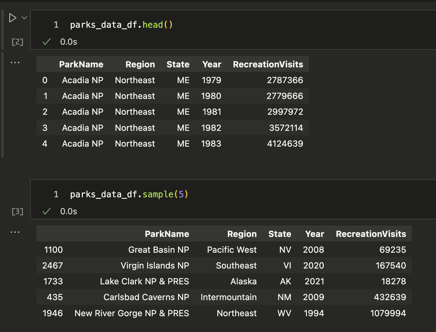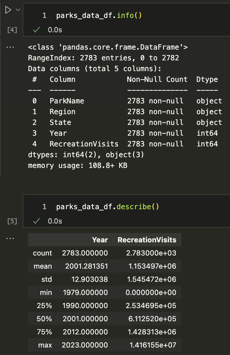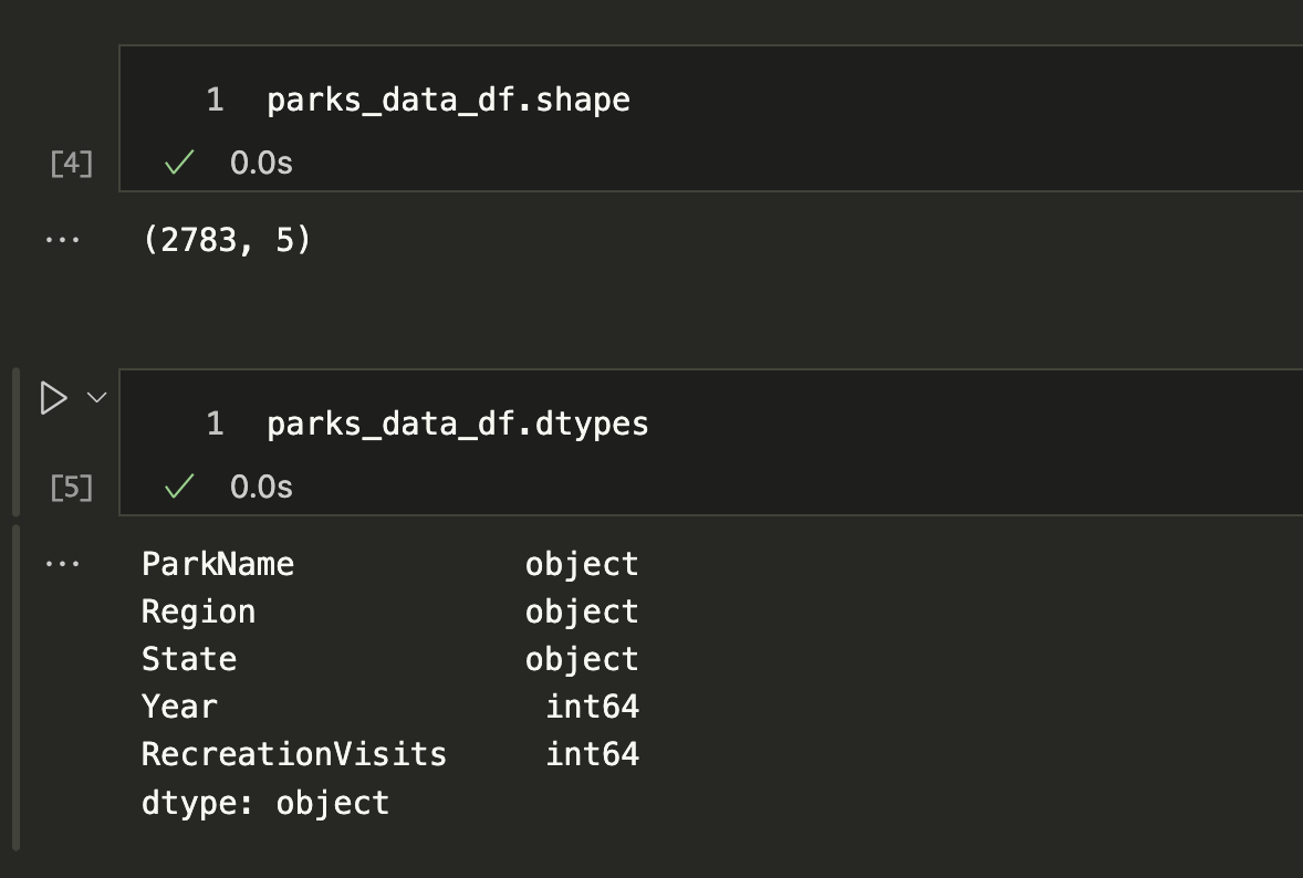 parks_data_df.columns = new_column_namesNow if we check the column names again, we should see that they are all lowercase and have underscores instead of spaces. However, we will only see that if we reload the original dataset, otherwise it will not work. Why is that? Hint: Remember Jupyter Notebooks are not Python scripts!