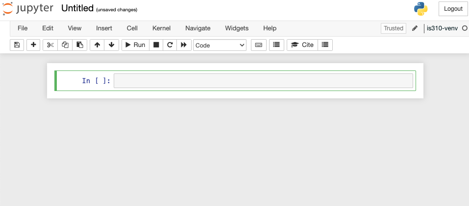 This opens up an empty notebook. You’ll notice that on the right hand side there’s a box that says Trusted and then next to that is the name of our virtual environment. This means that our notebook is running in our virtual environment. If you want to change this, you can select the Kernel dropdown menu and select a different virtual environment.