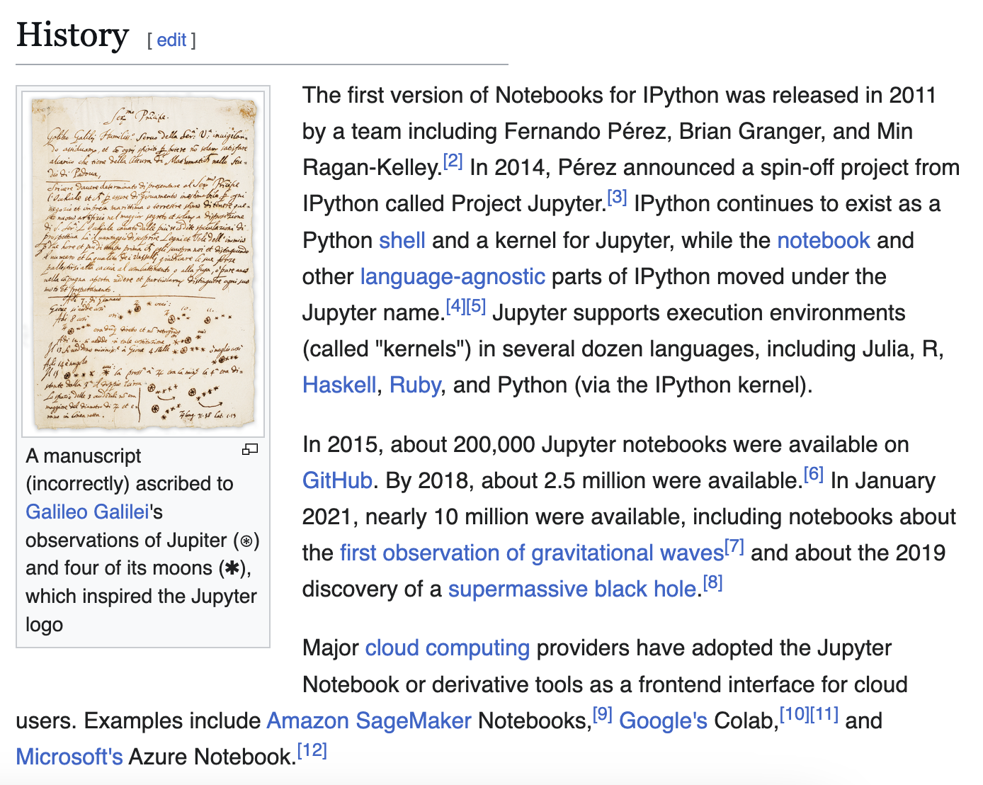 What really got Jupyter notebooks off the ground was the creation of IPython in 2001 as part of the creation of the Scipy and Numpy libraries, which was an interactive shell for Python. In particular, a group of developers, lead by Fernando Pérez, created the IPython notebook interface, which allowed users to create and share documents that contained live code, equations, visualizations, and narrative text for the first time in Python in 2011. This was the first version of Jupyter notebooks, and the name Jupyter is a nod to Galileo’s discovery of the moons of Jupiter (you can read more details on the wikipedia page https://en.wikipedia.org/wiki/Project_Jupyter).