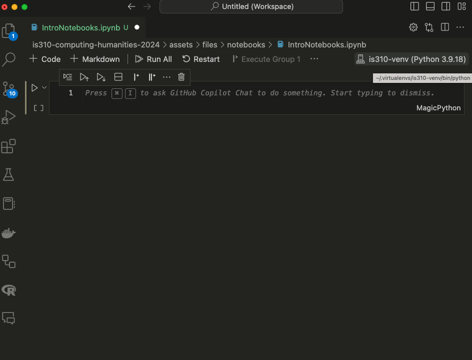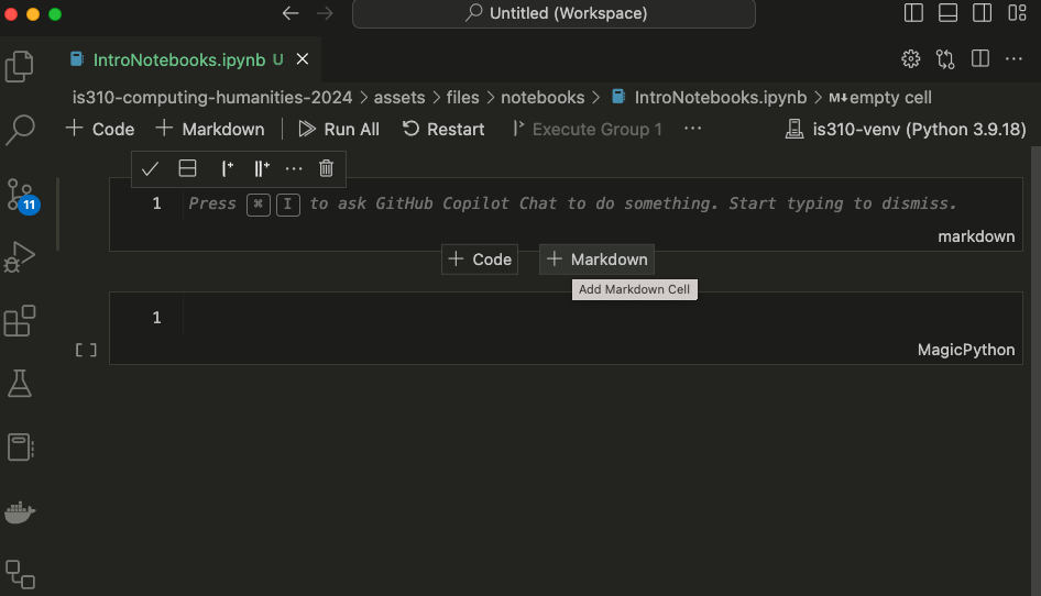 Now that we have our notebook, we can start writing some code. Jupyter notebooks have two types of cells: code cells and markdown cells.