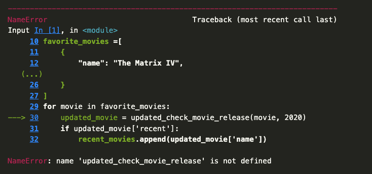 print(recent_movies)Unlike with our scripts where we would need to save our file and then type python3 script.py, we can just click on the cell and either press Shift + Return on a Mac or Shift + Enter on Windows to run the cell.