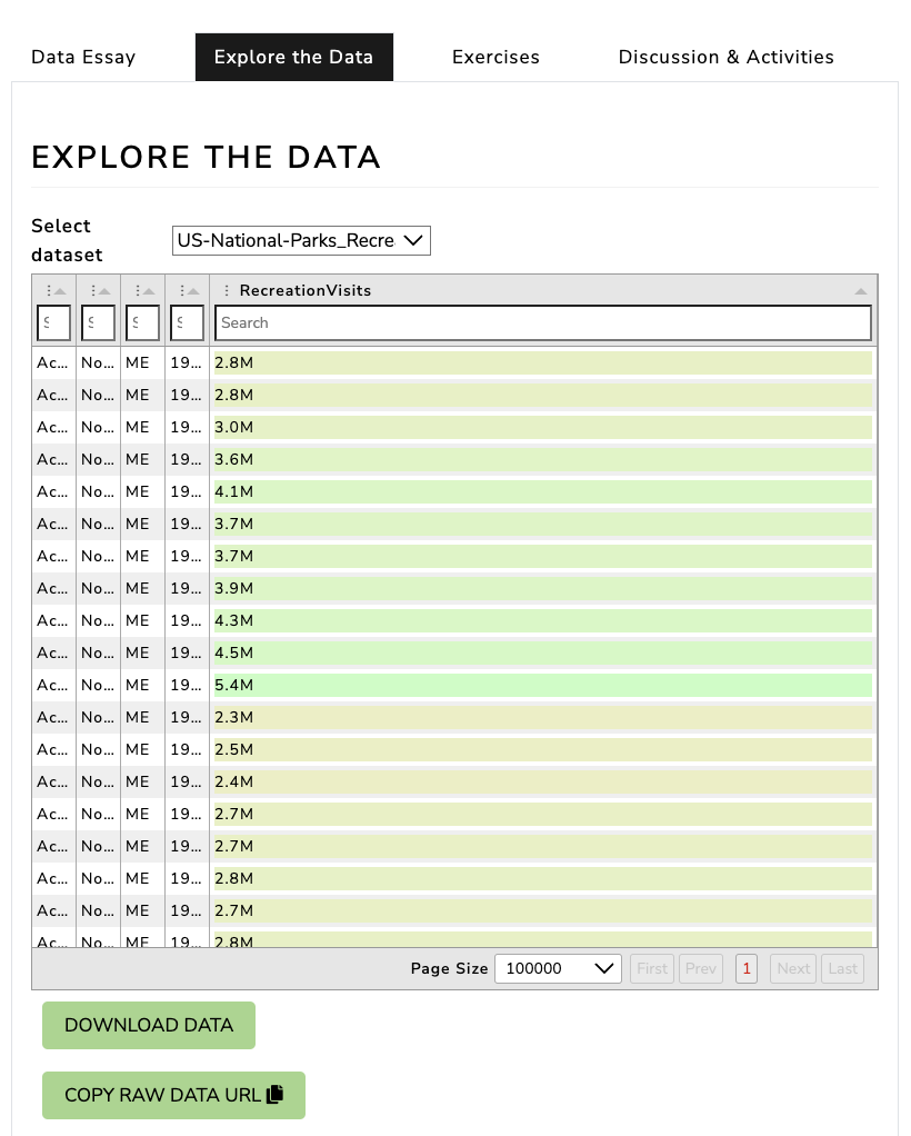 In the documentation for the National Parks Dataset, Walsh and Keyes have an Exercises page that you can find here: https://www.responsible-datasets-in-context.com/posts/np-data/exercises-python/NP-Data-Groupby-Pandas.html.