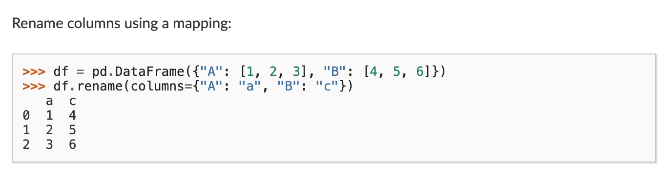 As you can see in this figure, we can use the rename() method, which requires passing a dictionary to the columns parameter, where the keys are the old column names and the values are the new column names.