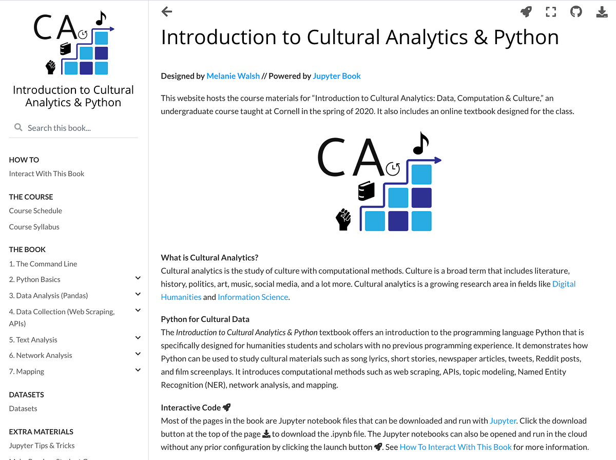 Some people even use Jupyter notebooks to publish books and articles. For example, Melanie Walsh’s textbook Introduction to Cultural Analytics & Python is a collection of Jupyter notebooks, combined into a Jupyter book (you can explore the code in this GitHub repository: https://github.com/melaniewalsh/Intro-Cultural-Analytics).